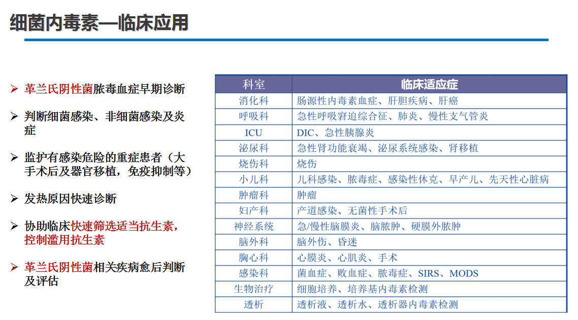 內(nèi)毒素:鑒別細(xì)菌感染(革蘭氏陰性菌),上機(jī)后1個(gè)小時(shí)內(nèi)快速檢測(cè)是否為革蘭氏陰性菌感染;